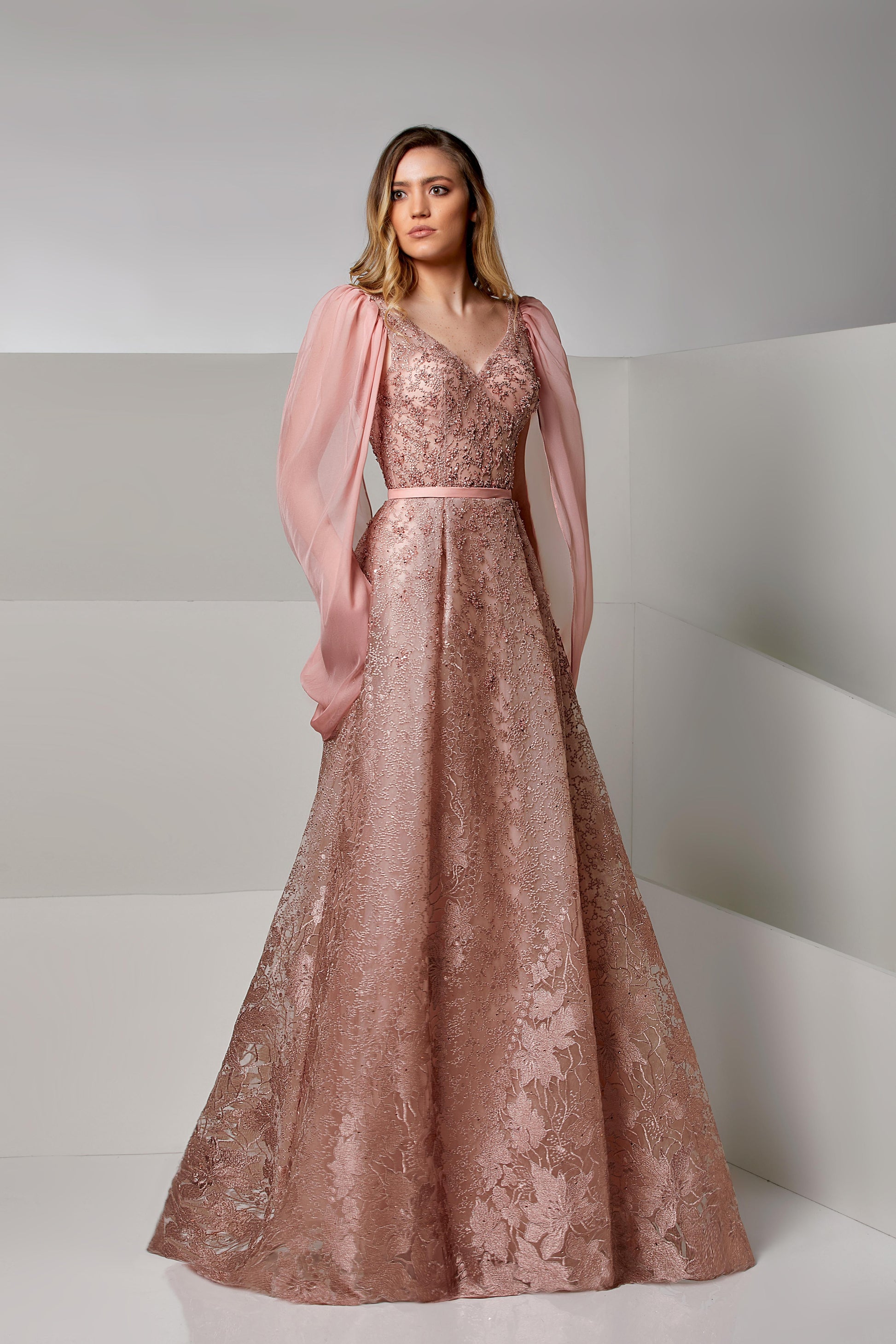 A-line silhouette gown featuring a shimmering lace overlay with intricate floral embroidery. The deep V-neckline enhances the feminine elegance, while the sheer, flowing cape sleeves add a touch of sophistication. A delicate satin waistband defines the waist, complementing the gown’s structured yet graceful drape.