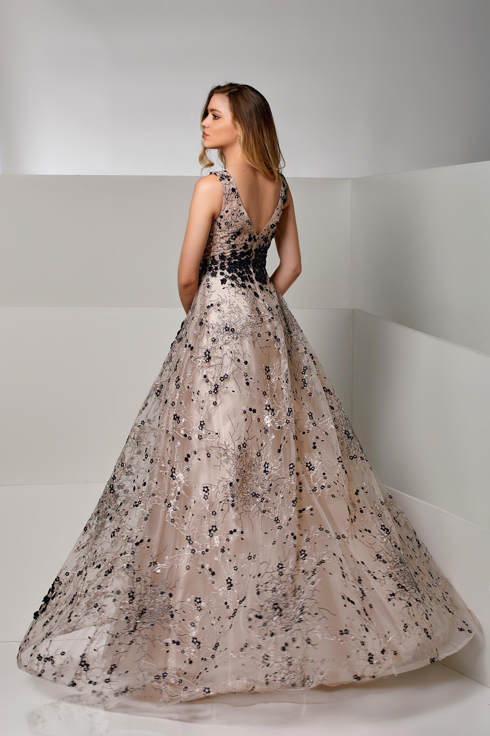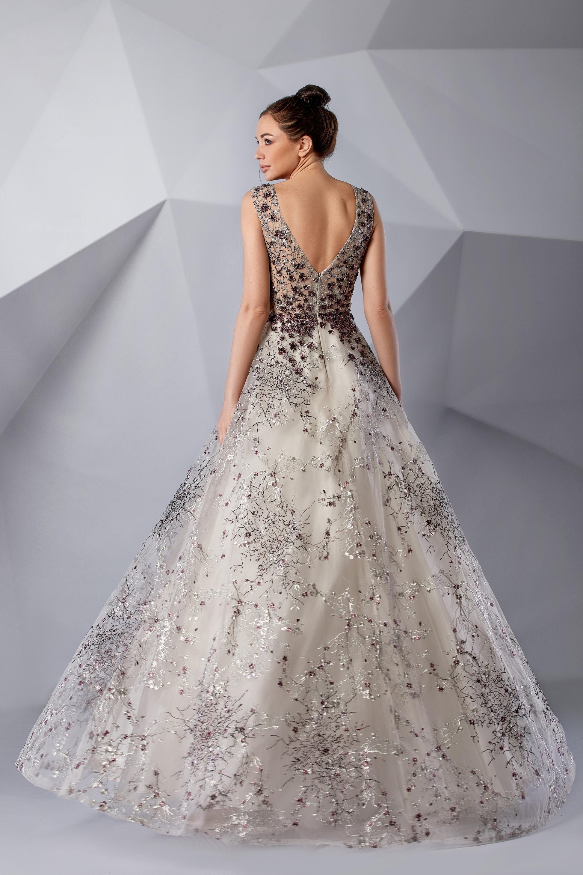 Floor-length gown featuring a daring plunging neckline that beautifully elongates the silhouette. The voluminous, flowing skirt cascades effortlessly to the floor. Crafted from delicate tulle, the entire dress is adorned with intricate embroidery, concentrated on the bodice for a strikingly detailed effect that gradually fades as it flows into the skirt.