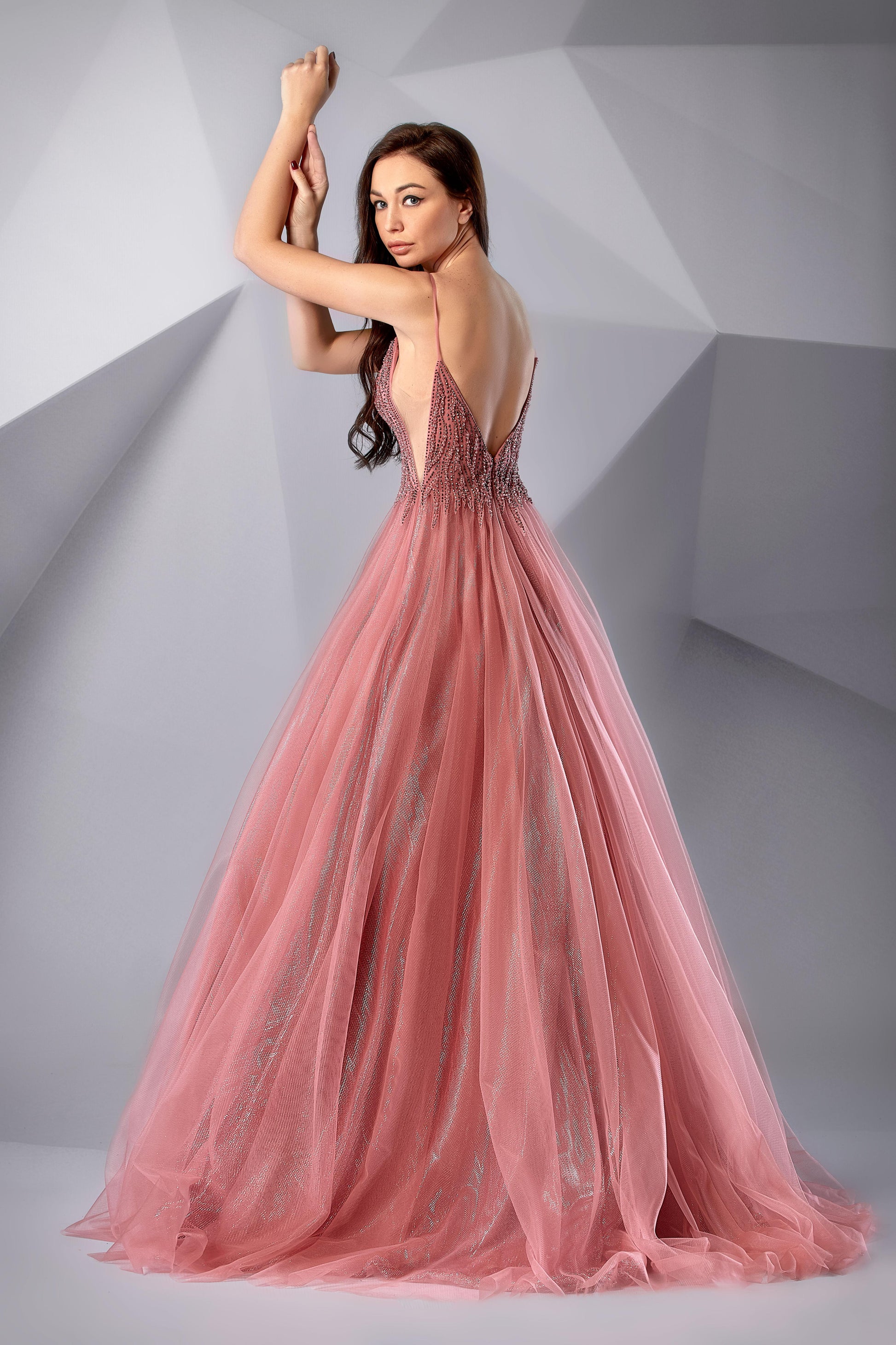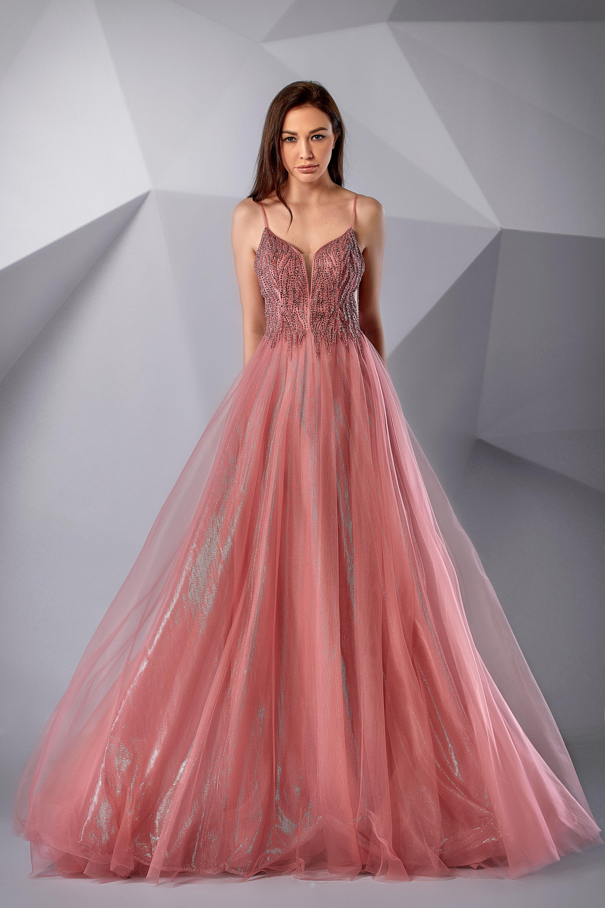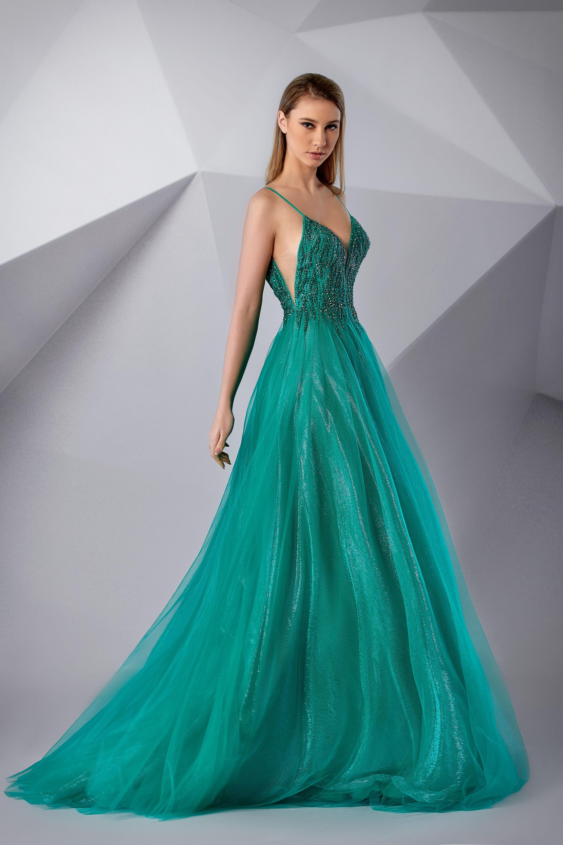 A-line gown. The bodice is adorned with intricate embroidery and delicate beadwork. A plunging neckline and thin straps add a touch of sophistication. Flowing effortlessly from the waist, the simple yet ethereal tulle skirt adds softness.