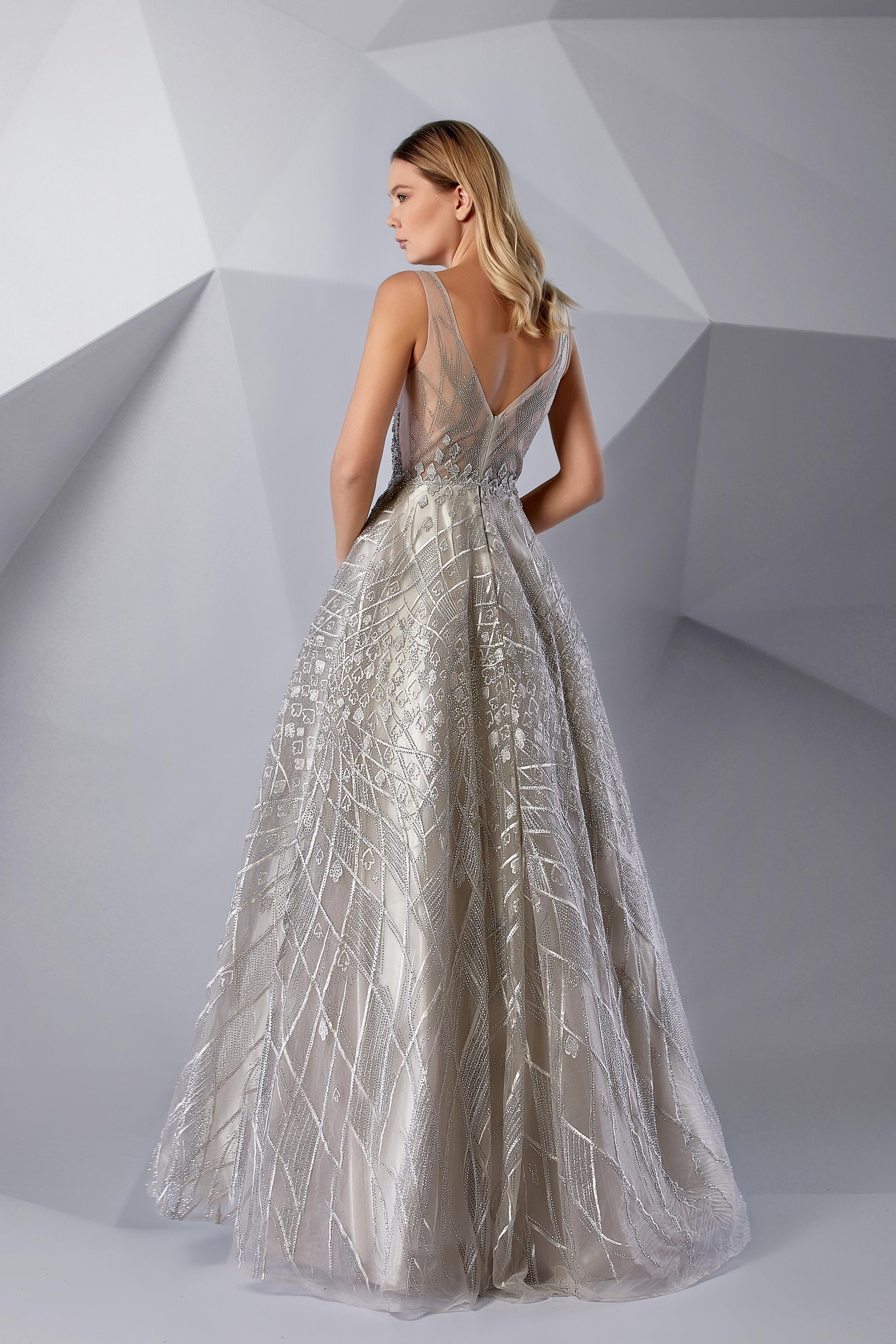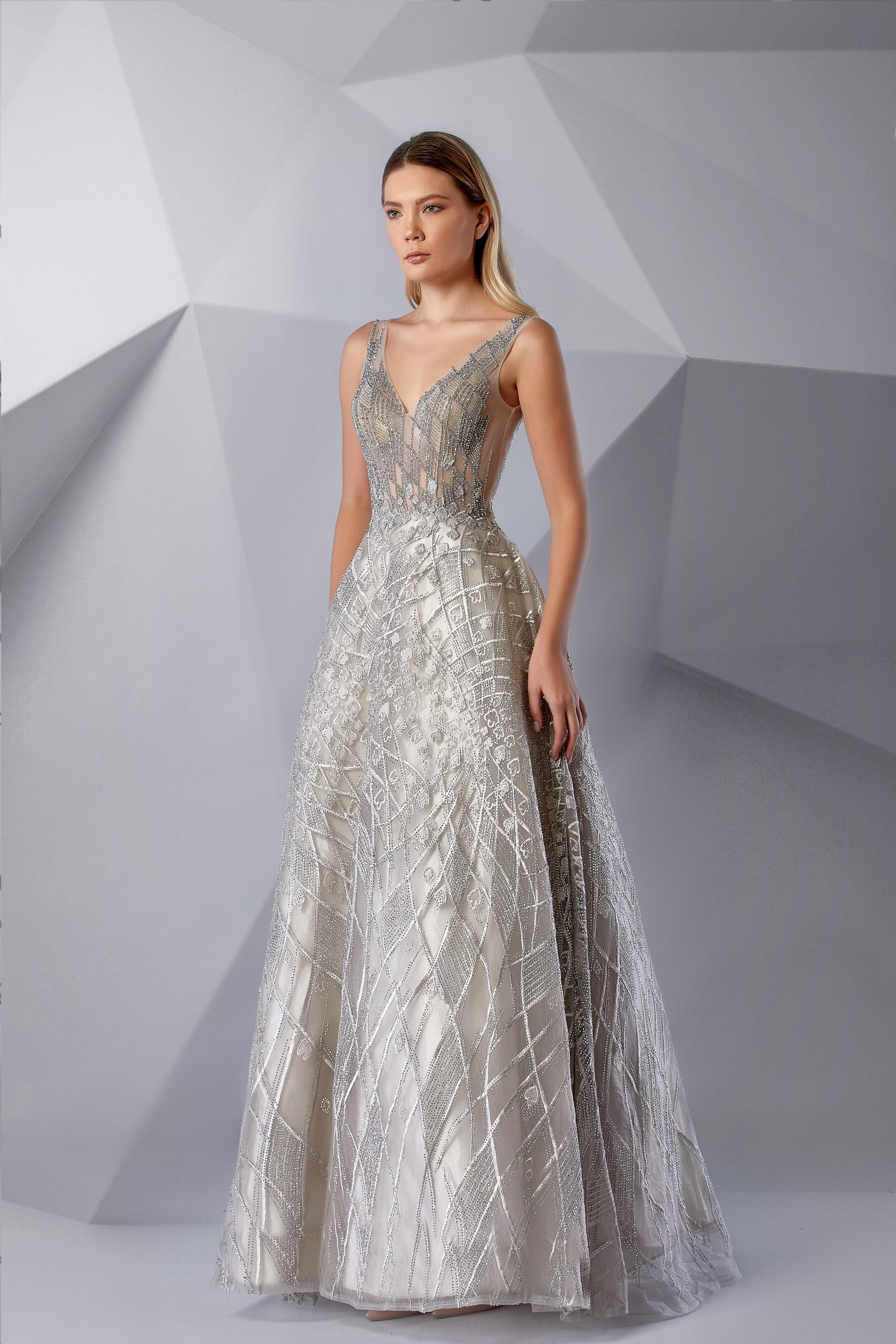 Floor-length A-line evening dress. The gown boasts a graceful V-neckline and back, with a strapless design. The corset is crafted from embroidered sheer fabric and the A-line skirt is made from intricate embroidery revealing satin fabric underneath.
