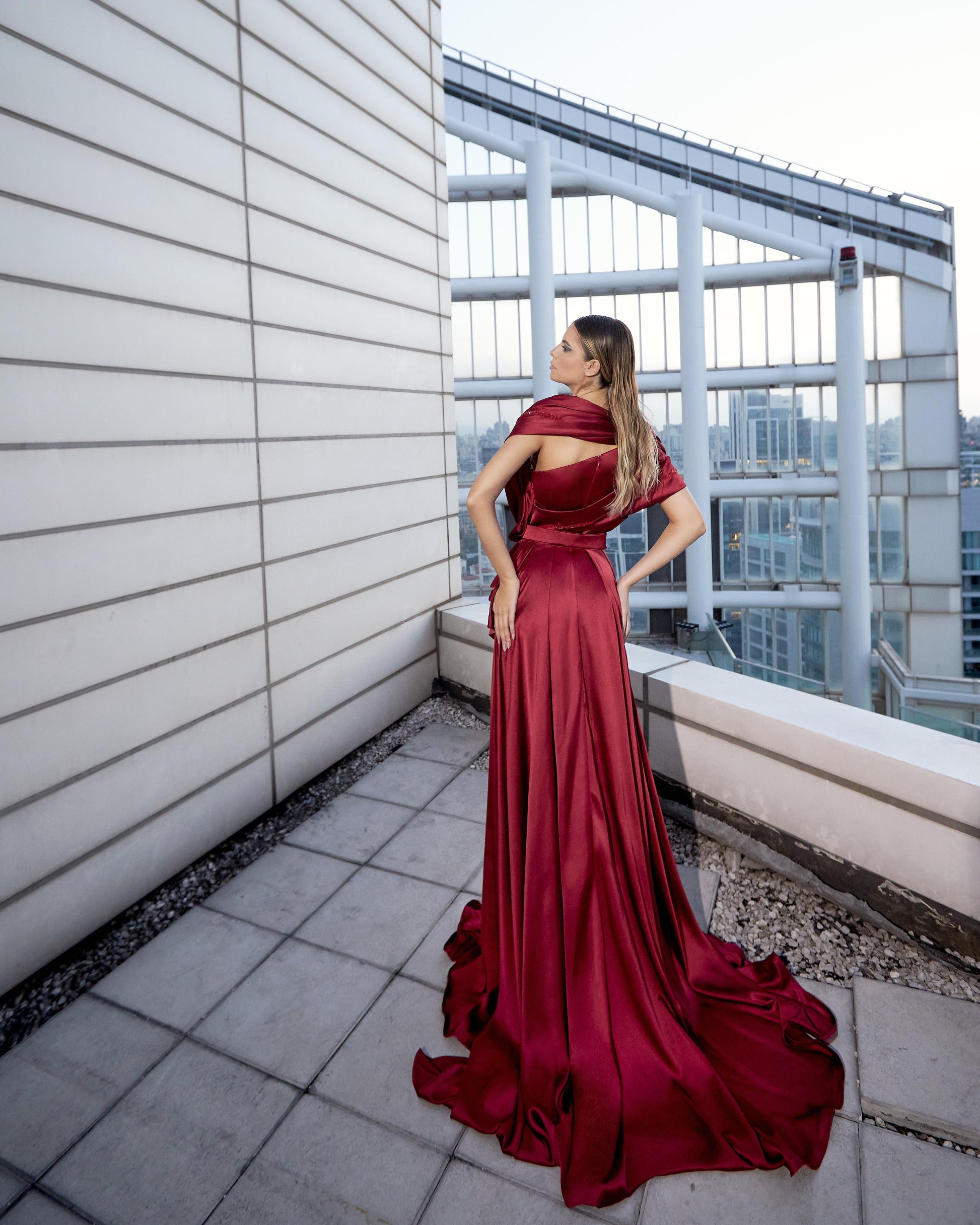 Sophisticated one-sleeve A-line evening dress with a graceful diagonal neckline and back. This floor-length gown boasts a delicately embroidered bodice, while a satin belt elegantly cinches the waist, mirroring the fabric. The left side features an artful shaping.