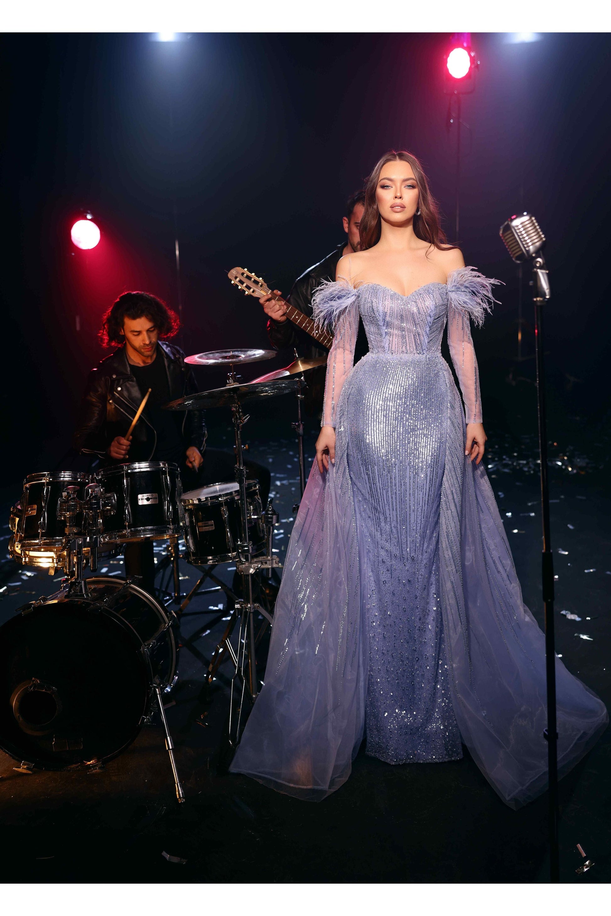 Captivating strapless evening dress featuring a romantic heart-shaped neckline and a flattering mermaid cut with a defined waist. Intricate embroidery graces the entire gown, while the back showcases an attached tulle-like fabric that flows gracefully from both sides, adorned with fading embroidery on the hem. Off-the-shoulder sleeves, embellished with feathers, lead to sheer, long sleeves adorned with delicate embroidery.