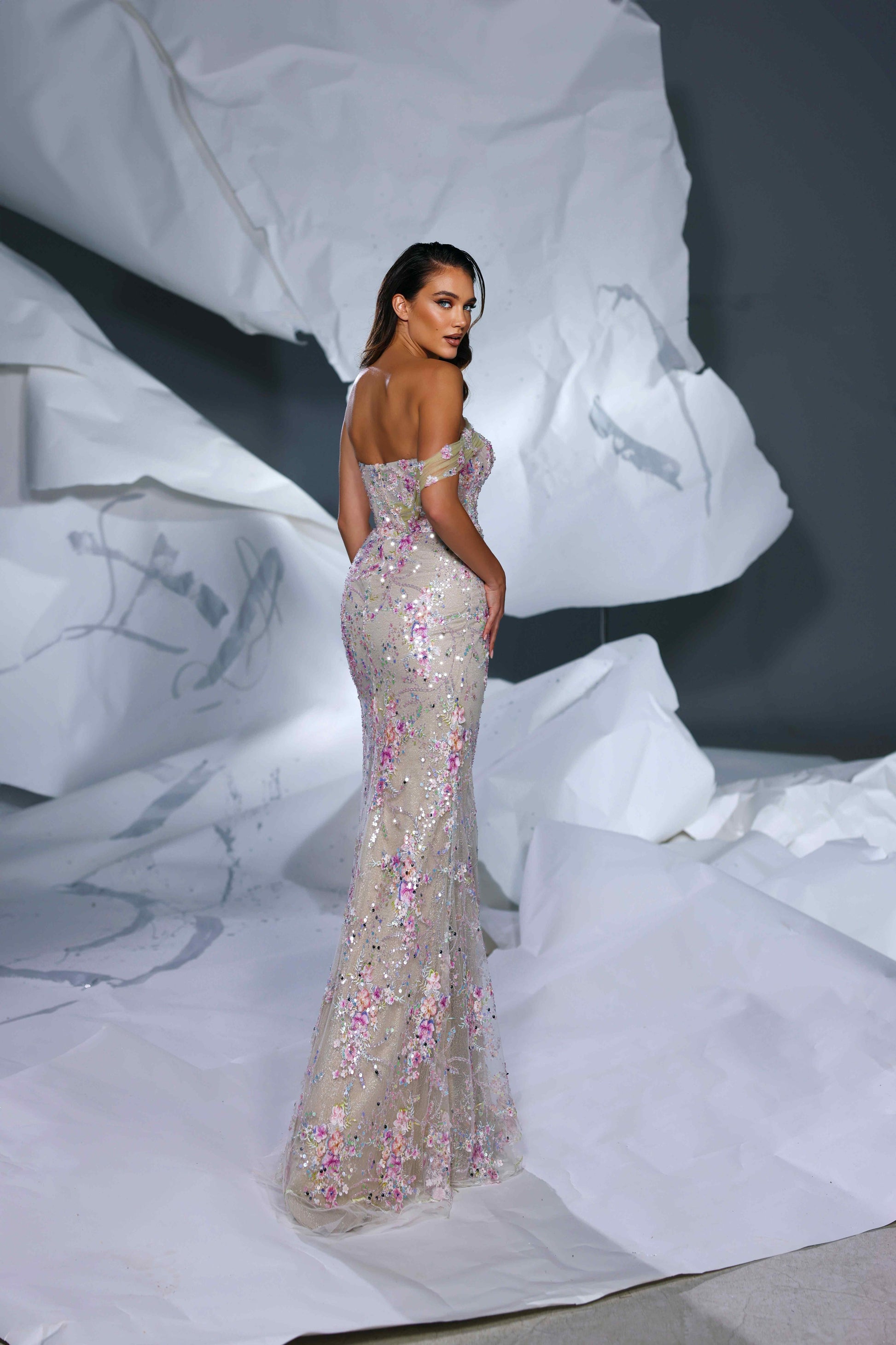 This gown features a mermaid cut floor length silhouette with a thigh high slit. The neckline is strapless, showcasing the shoulders. On the right side, the dress features an off-the-shoulder design. The entire gown is adorned with small flower embroidery.